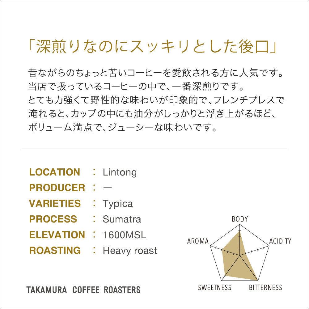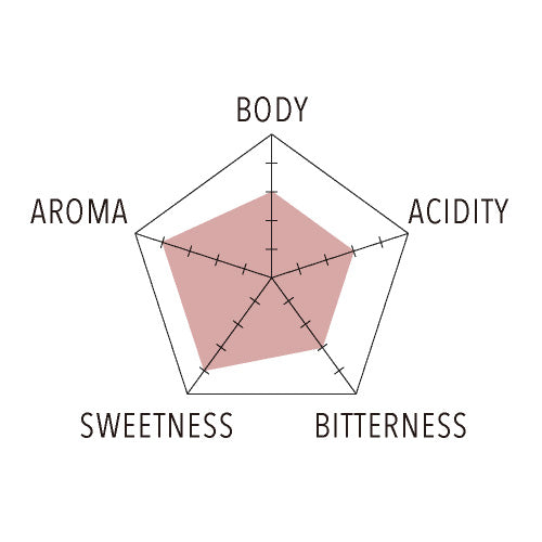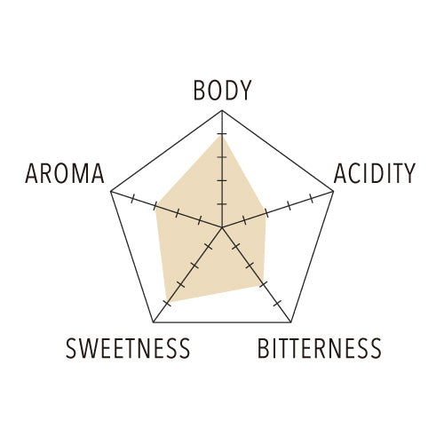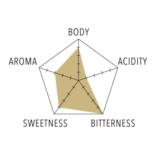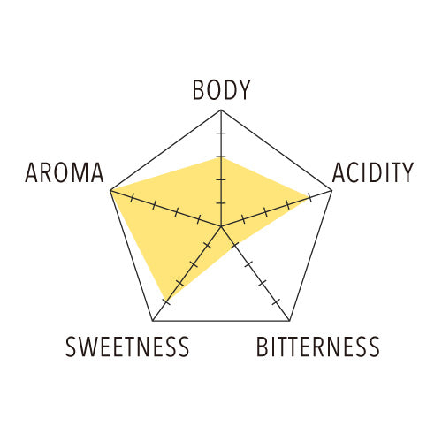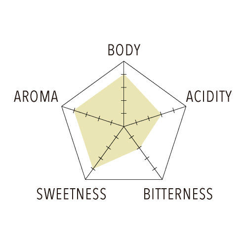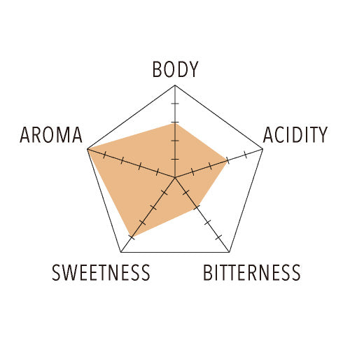 こちらは『深煎り』タイプ。香りはよりエキゾチックな複雑さが増し、口当たりはまろやかでドライフルーツや黒蜜のような甘さを感じます。アフターティストでは心地よい余韻を楽しむことができます。