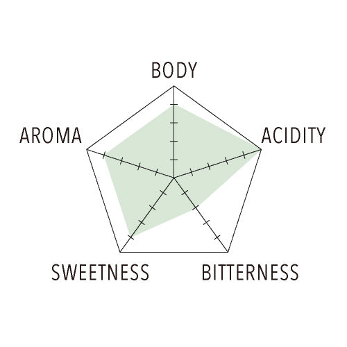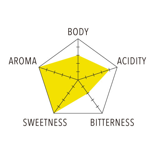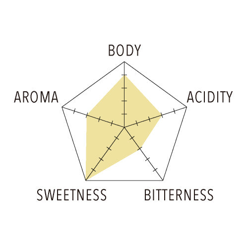 熟度が高く、脂質やショ糖の含有量が多いので焙煎によるカラメル化が起きやすいのが最大の特徴です。ショ糖が多いので色づきやすく、深煎りだけど、あまり時間をかけずに焙煎することができます。なので過度にストレスがかからず、明るいフレーバーを感じることができ、甘さと質感のバランスの良さを体感できます。
