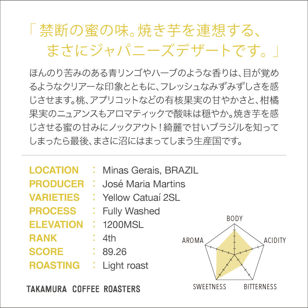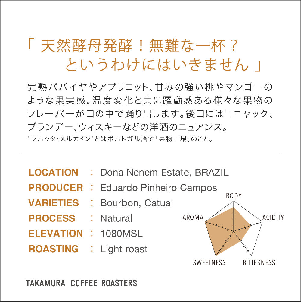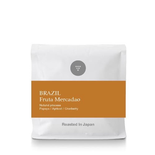 精製過程に、天然酵母による発酵プロセスを導入することで、より顕著にフルーティーなフレーバーを持たせたコーヒー「フルッタ メルカダオ」。フルッタ メルカダオとは、ブラジルの公用語であるポルトガル語で『果物市場』を意味し、その言葉の通り、この特別なコーヒーは熱い時と冷めた時の表情に様々なフルーツが顔を見せます。精製時にある種の天然酵母により発酵させるという、従来とは異なるプロセスにより生み出された意欲的な特別ロット。どなたのお口にも合う無難な一杯、というわけにはいきませんが、ぜひ体感してほしい、芳醇でインパクトのある一杯です。