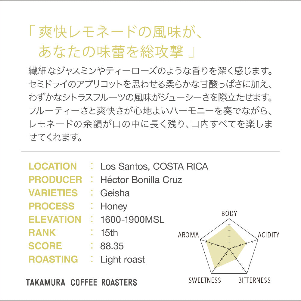 エチオピア起源の原種といわれるこのゲイシャが世界の注目を集めたのは2004年。パナマの国際オークション(Best of Panama)でラ・エスメラルダ農園が出品した『Jarmillo Especial』が当時の最高落札価格を記録したことからはじまりました。