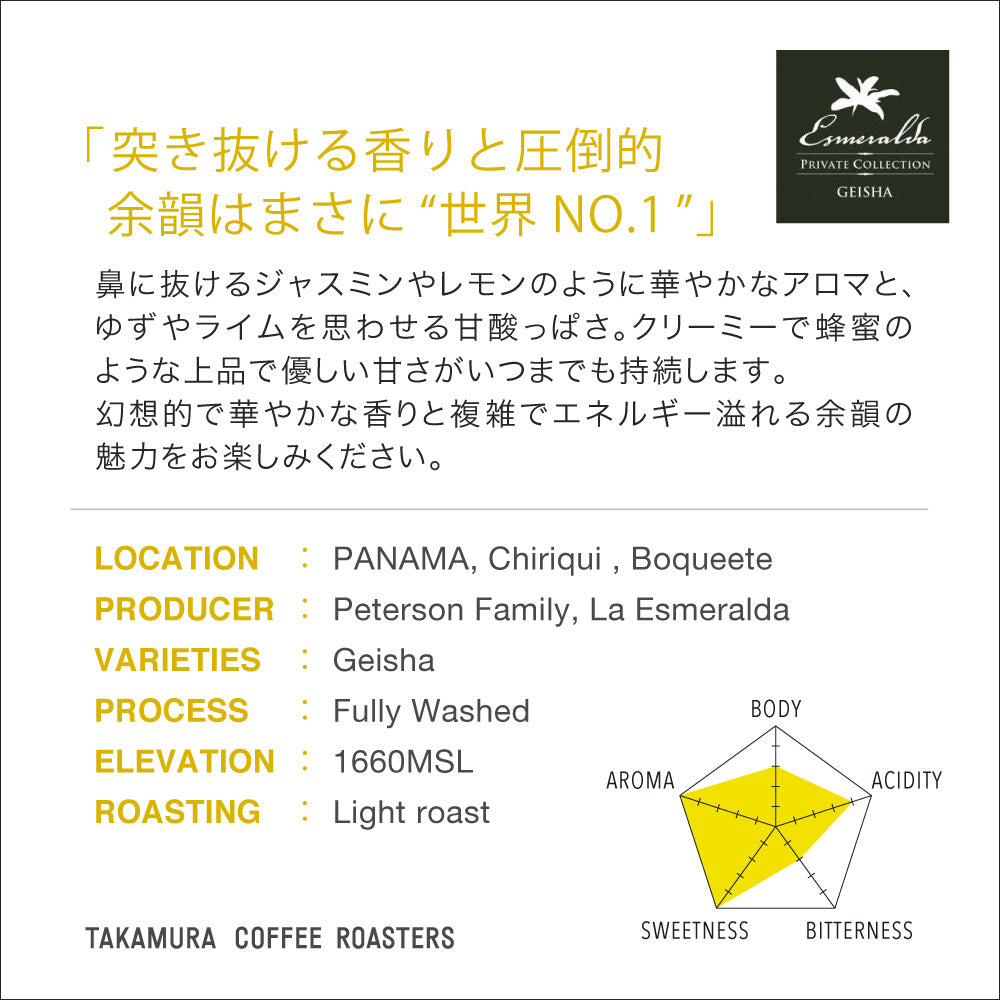 ラ・エスメラルダ農園は、パナマ西部・バルー火山の山すそに広がり、平均標高1,600m、豊かな降雨に恵まれ、農園内にも天然林が保護されているなど、豊かな自然環境に囲まれています。また、農薬を使わず、完熟実だけを手摘みし、収穫後の加工も細心の注意を払って行われているなど、まさに『世界最高のコーヒー』が生産されるにふさわしい農園です。